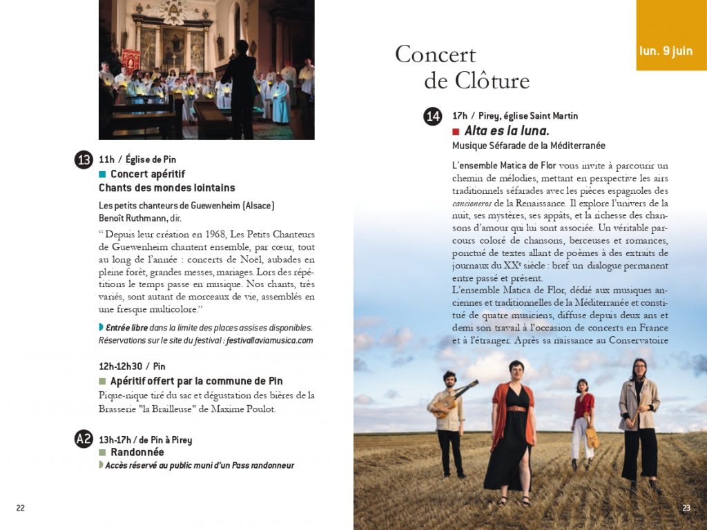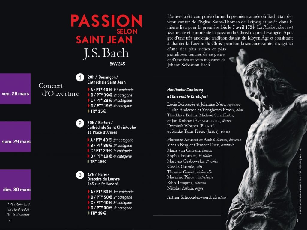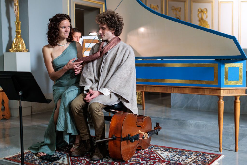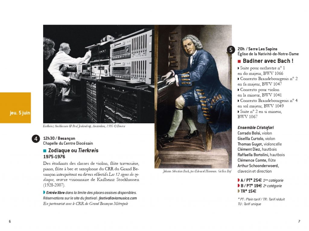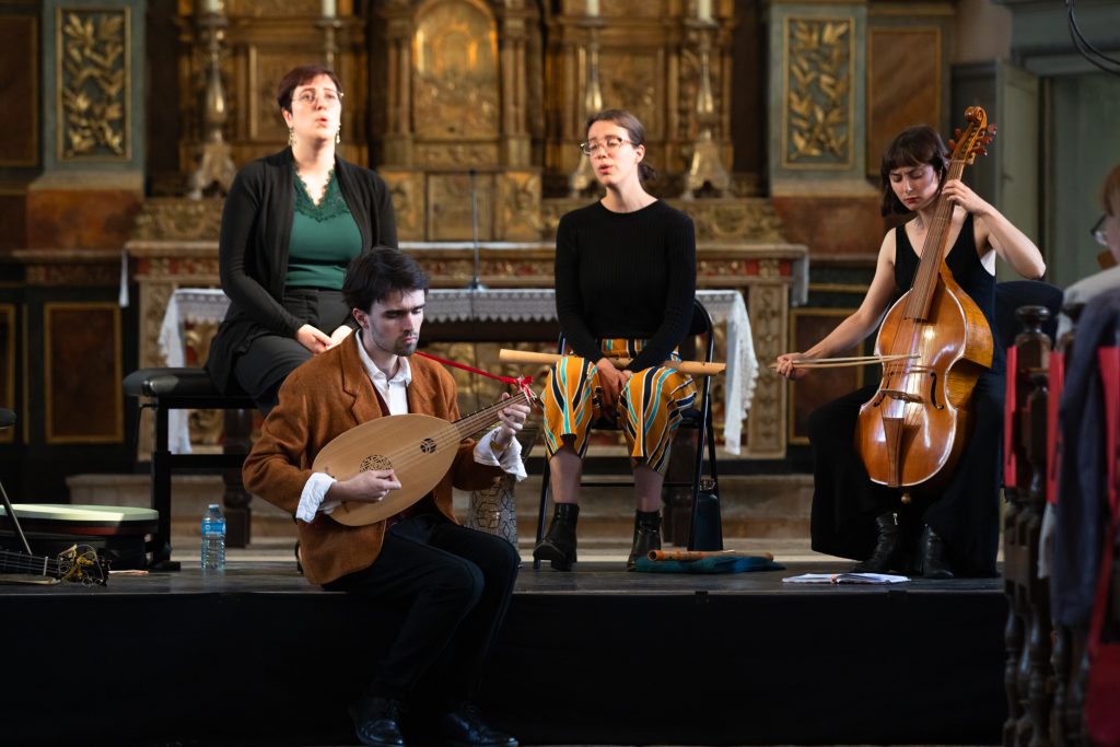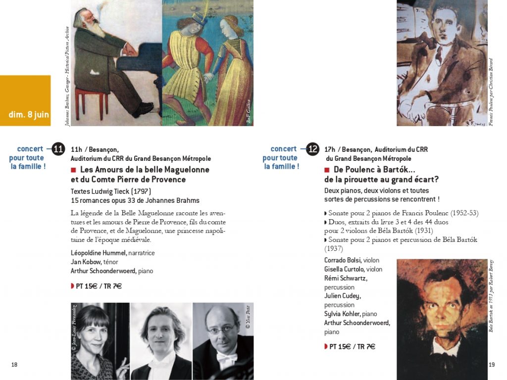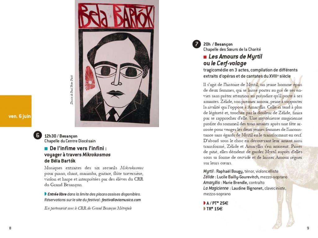 Raphaël Bougy (ténor et violoncelle)et Marie Brendle (contralto) dans Les Amours de Myrtil ou le Cerf-volageLaudine Bignonet, clavecin et mezzo-soprano dans lLes Amours de MyrtilLucile Bailly-Gourevitch, mezzo-soprano comme Zélide dans Les Amours de Myrtil.Badiner avec Bach, avec l’Ensemble Cristofori à Serre les SapinsTierkreis avec les élèves du CRR du GBMEt Bartok avec le CRR du GBM!Isabelle Druet et l’Ensemble Cristofori dans un programme Händel au Théâtre Ledoux à Besançon.La sonate de Poulenc pour 2 pianos et la fameuse sonate de Bartok avec Sylvia Kohler et Arthur Schoonderwoerd piano et Rémi Schwartz et Julien Cudey percussion. Lisandro Nesis, narrateur dans la belle Maguelonne….Alta es la Luna par l’Ensemble Matica de Flor à l’église de Pirey!Massimo Pinca (contrebasse) et Layal Ramadan (viole) avec l’Ensemble Cristofori dans la passion selon Saint Jean de Johann Sebastian Bach à Paris, Oratoire du LouvreArmand Thomas et Martyna Grabowska, violons, avec l’Ensemble Cristofori.Arthur Schoonderwoerd qui dirige l’Ensemble Cristofori dans la passion. Florence Aoustet, flûte traversière et Vivian Berg Hautbois.
